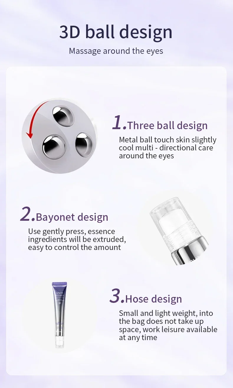 •Integrated Roller Massager: The smooth, cool metal roller tip allows for hygienic, hands-free application. It gently massages the eye contour, enhancing the absorption of the cream while stimulating lymphatic drainage to reduce swelling.